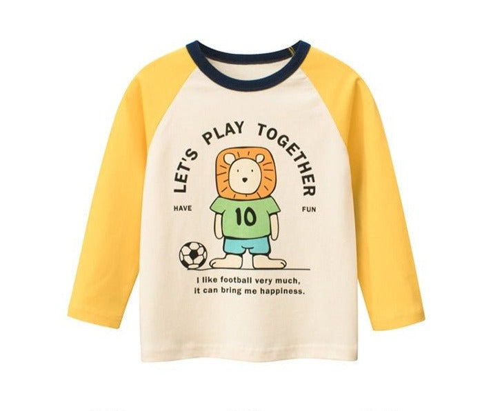 The shirt features a cream-colored body with vibrant yellow raglan sleeves, accented by a sturdy navy blue neckline for added durability. The center graphic showcases a friendly lion character ready for the big game, complete with a soccer ball and a “10” jersey. Below the illustration, the heartwarming text reads: “I like football very much, it can bring me happiness,” promoting a positive and active lifestyle.