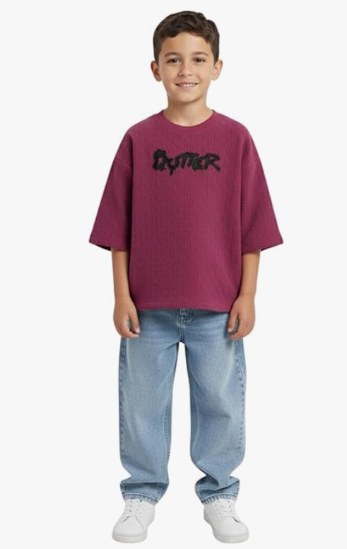 Elevate his casual style with our Boys’ “BUTTER” Textured Oversized T-Shirt. Moving away from the standard flat cotton tee, this shirt features a distinct textured weave that adds depth and a premium touch to his outfit. The deep plum color provides a rich, stylish alternative to everyday neutrals.
