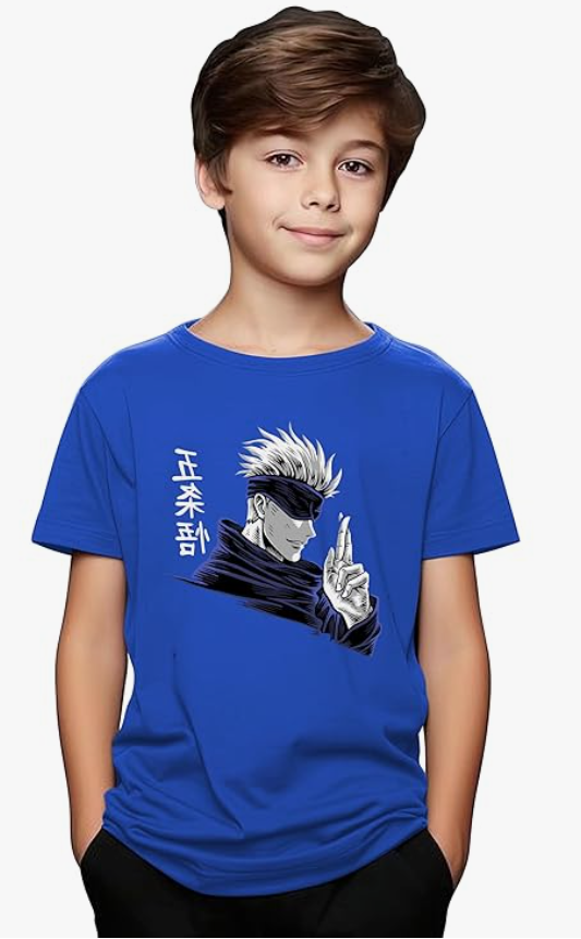 Unleash the power of the strongest sorcerer with our Boys’ Jujutsu Kaisen Satoru Gojo Anime T-Shirt. This vibrant royal blue tee showcases a detailed, monochrome graphic of the fan-favorite character, Satoru Gojo, performing his legendary hand sign. Accompanied by authentic Japanese kanji, the design perfectly captures the aesthetic of the hit anime series.