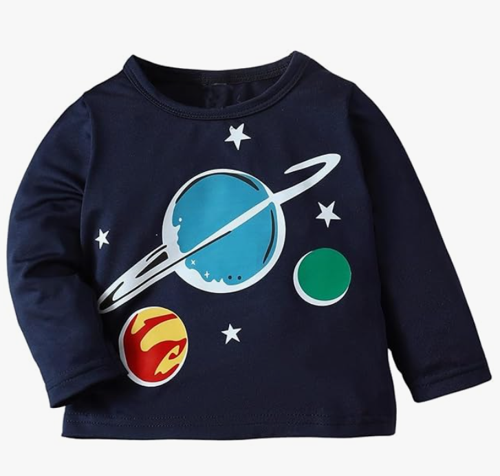 Fuel your little explorer’s imagination with our Boys’ Planet & Galaxy Space Graphic T-Shirt. This navy blue long-sleeve tee is perfect for any young astronomer, featuring a bold and artistic depiction of our solar system. The center graphic highlights a ringed planet accompanied by vibrant red and green celestial bodies, set against a backdrop of twinkling stars. Crafted from high-quality, soft-touch fabric, this shirt provides the perfect balance of warmth and breathability. Whether they are learning about the stars in school or playing at home, this durable and stylish top is a stellar addition to any wardrobe.